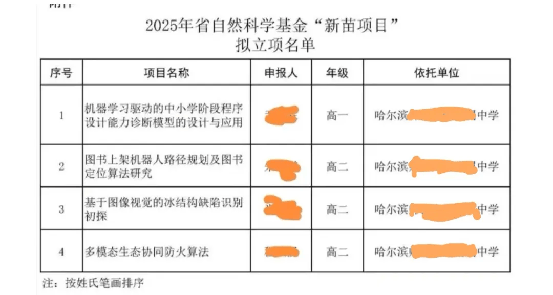 据悉,2月12号,哈尔滨师范大学附属中学官微发布文章《关于2025年度黑龙江省自然科学基金 “新苗项目”拟资助名单公示》,公示期为2026年2月10日到2月14日。据公示名单,该校一名高一学生和三名高二学生共计四名中学生拟获黑龙江省自然科学基金 “新苗项目”资助。