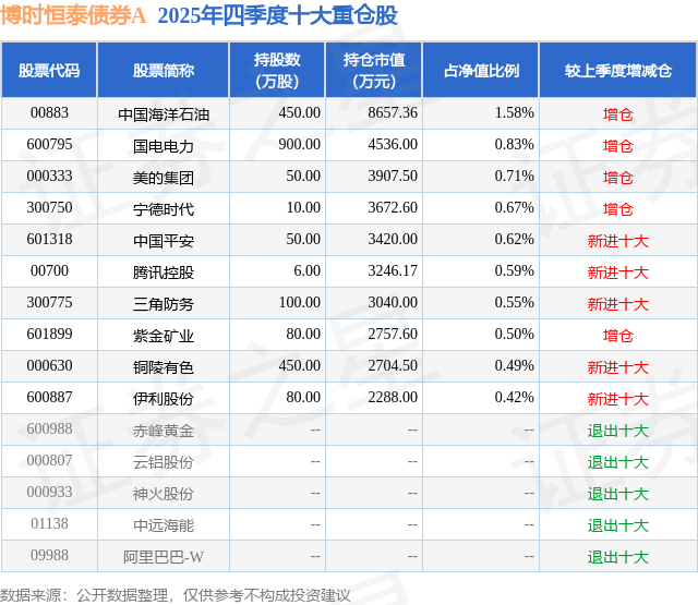 根据2025基金年报公募基金重仓股数据,重仓该股的公募基金共13家,其中持有数量最多的公募基金为博时基金的博时恒泰债券A。博时恒泰债券A目前规模为9.9亿元,最新净值1.1871(3月17日),较上一交易日下跌0.13%,近一年上涨6.27%。该公募基金现任基金经理为张李陵 静鹏 唐薇。张李陵在任的基金产品包括:博时信用债纯债债券A,管理时间为2020年7月13日至今,期间收益率为21.58%;博时恒泽混合A,管理时间为2021年2月8日至今,期间收益率为18.87%;博时博盈稳健6个月持有期混合A,管理时间为2021年8月10日至今,期间收益率为-1.55%。静鹏在任的基金产品包括:博时乐臻定开混合,管理时间为2024年8月13日至今,期间收益率为14.75%;博时恒旭持有期混合A,管理时间为2024年8月13日至今,期间收益率为22.4%;唐薇在任的基金产品包括:博时富鑫纯债A,管理时间为2022年6月15日至今,期间收益率为13.39%;博时慧选纯债定开债,管理时间为2022年9月9日至今,期间收益率为9.29%;博时聚润纯债债券A,管理时间为2024年3月21日至今,期间收益率为5.3%;博时中高等级信用债A,管理时间为2024年5月7日至今,期间收益率为5.44%。