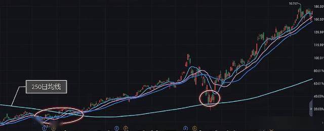 250日均线即年线,是划分牛熊的分界线。年线向上运行时,市场处于牛市行情;短中期均线粘合在一起,说明市场持仓成本趋于一致,行情即将爆发。当股价放量突破粘合的三条均线,就代表攻击力度强劲,可果断介入,也能在后续回调中逢低加仓,享受主升浪红利。
