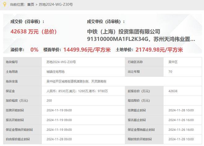 中铁咏月台,即,苏地2024-WG-Z30号地块项目,位于吴中经开区城南街道枫津路东侧、天灵路南侧,是2024年11月28日,中铁&天鸿伟业以底价42638万元竞得,成交楼面价14500元/平。